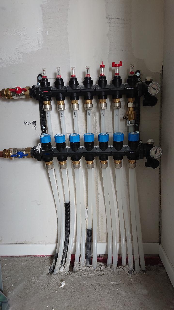 De slaapkamers hebben dezelfde temperatuur als de woonkamer. Je kunt de slaapkamertemperatuur in de winter verlagen door het dicht draaien van de groepen op de verdeler (blauwe knop) en/of door het openen van ramen. De temperatuur in de slaapkamer kan echter nooit hoger worden dan in de woonkamer (behalve door invloed door de zon). Je vindt de aansluiting voor de vloerverwarming (de vloerverdeler) in de installatieruimte.